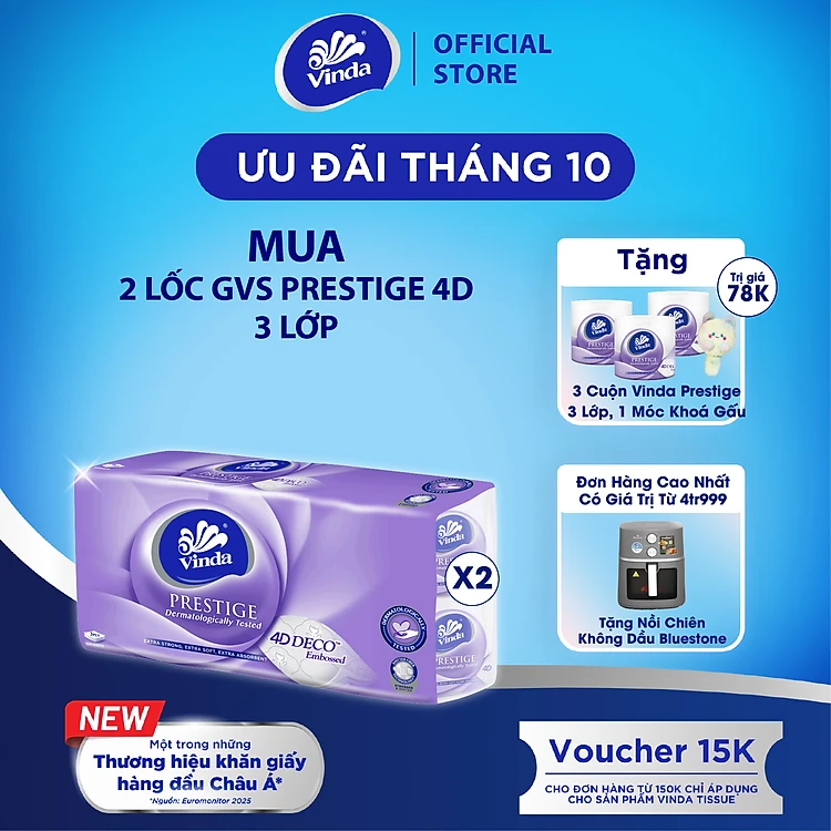 [MUA 2 LỐC GVS PRESTIGE 4D TẶNG 3 CUỘN + 1 MÓC KHÓA] Giấy vệ sinh cao cấp Vinda Prestige 4D 3 lớp (8 Cuộn)