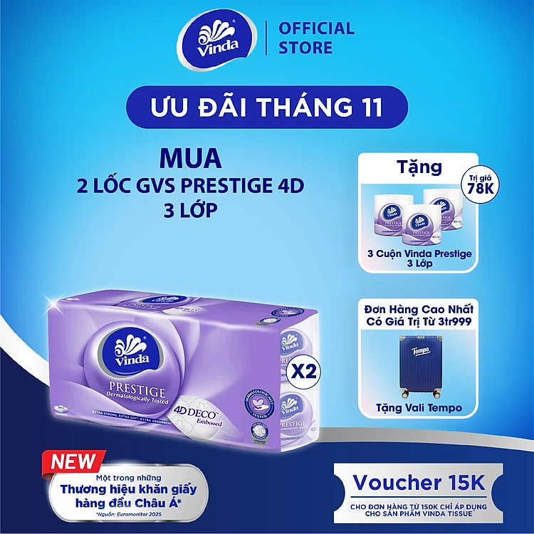 [MUA 2 LỐC GVS PRESTIGE 4D TẶNG 3 CUỘN] Giấy vệ sinh cao cấp Vinda Prestige 4D 3 lớp (8 Cuộn)