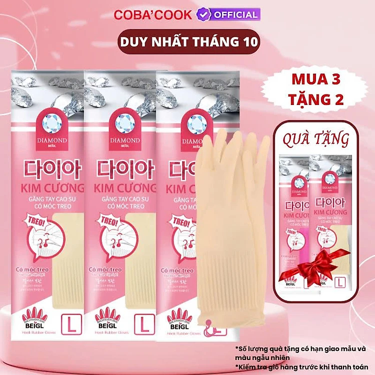 [Mua 3 Tặng 2] Combo3 Đôi Găng Tay Cao Su Tự Nhiên Kim Cương Có Móc Hàn Quốc L-39cm