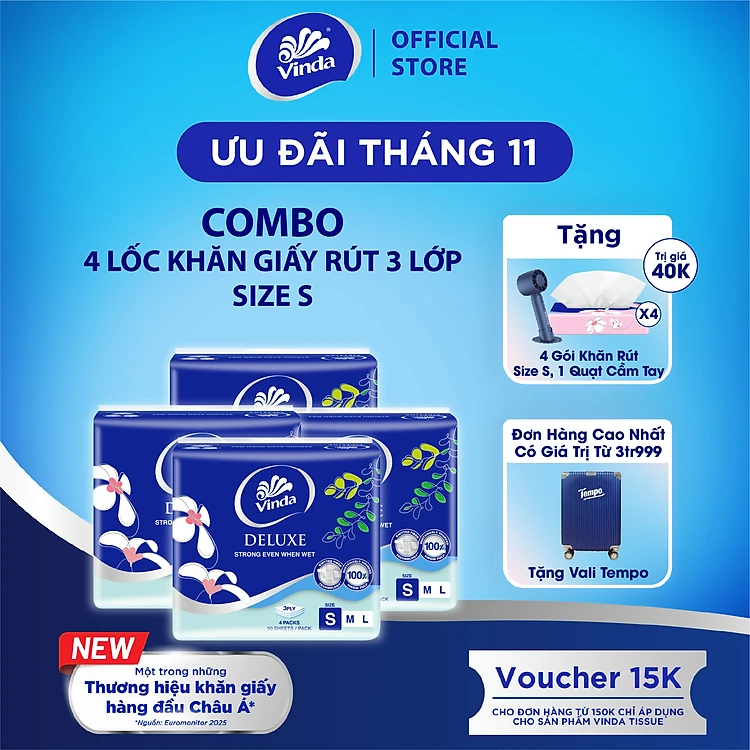 [MUA 4 LỐC SIZE S TẶNG 4 GÓI SIZE S + 1 QUẠT CẦM TAY] Khăn giấy rút cao cấp Vinda Deluxe 3 lớp 50 tờ size S (4 Gói)