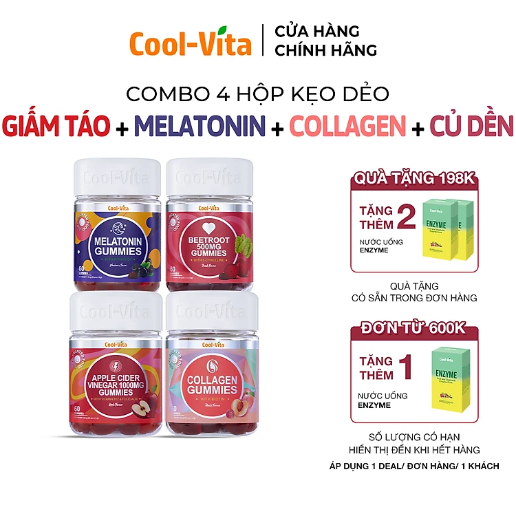 [Mua 4 tặng 2] Combo Kẹo Dẻo Giấm Táo, Kẹo Dẻo Collagen , Kẹo Dẻo Melatonin, Kẹo Dẻo Củ Dền Coolvita - Tặng 2 Hộp Nước Uống Bổ Sung Enzyme Hỗ Trợ Tiêu Hoá, Thanh Lọc Cơ Thể Cool-Vita (45 ml× 7 túi)/hộp