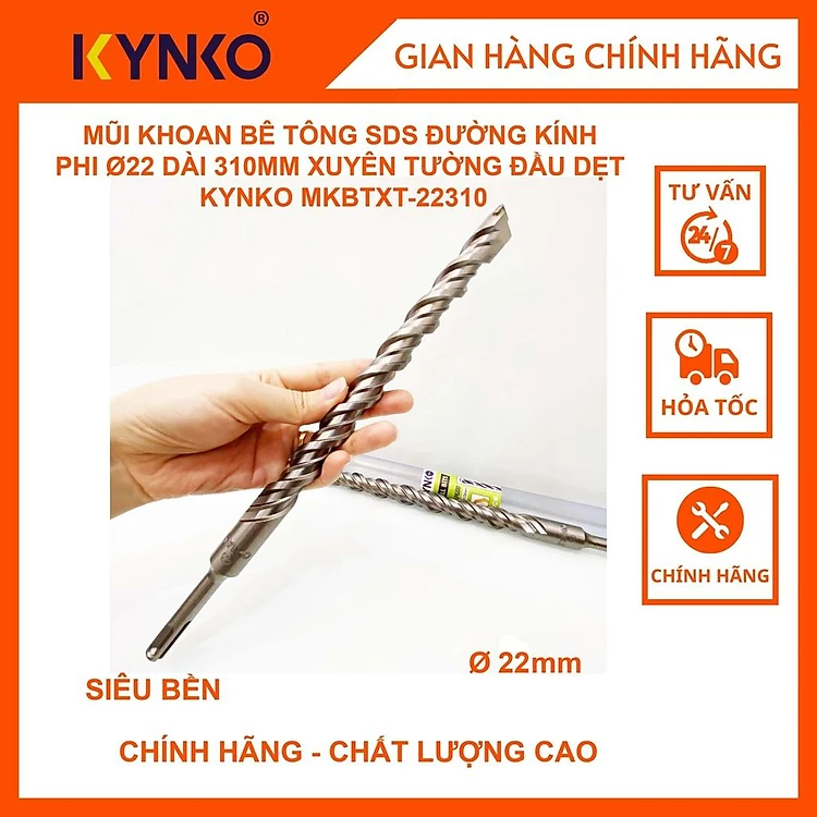 MŨI KHOAN BÊ TÔNG SDS ĐƯỜNG KÍNH PHI Ø 22 DÀI 310MM XUYÊN TƯỜNG ĐẦU DẸT KYNKO MKBTXT- 22310