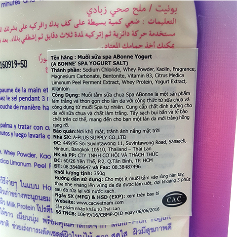 - Muối sữa Abonne Yogurt túi 350g có thành phần chính là muối và sữa ngoài ra còn nhiều chất khác để cung cấp cho da nhiều dưỡng chất nhất.
