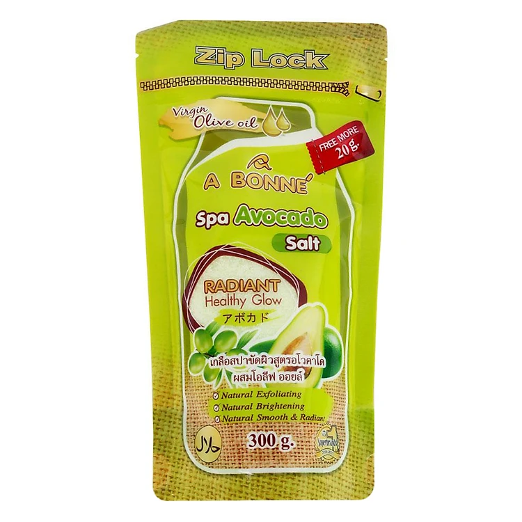 • Muối Tắm Spa A Bonne Bơ (Zip Lock) (300g) Với những hạt muối siêu mịn được lựa chọn kỹ càng, giúp lấy đi những tế bào da bị ảnh hưởng bởi thời tiết mà không gây kích ứng, cho làn da trắng sáng, đồng thời kết hợp giúp ngăn ngừa hình thành sắc tố da, chống nhăn và giữ da mềm mịn.