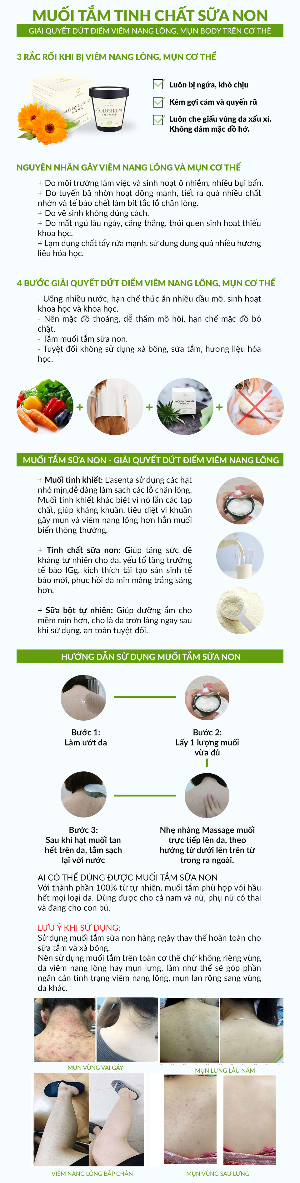 Đối với người đang gặp tình trạng mụn trên body, viêm chân lông, da thâm sần, muối tắm sữa non lấy sạch các tế bào chết, dư thừa trên bề mặt da. Làm thông thoáng lỗ chân lông, giải phóng cho nút bít tắc dưới lỗ chân lông lâu ngày gây ra. Đồng thời kháng khuẩn, tiêu diệt sạch vi khuẩn gây mụn, làm hạn chế tối da vi khuẩn lây lan sang vùng da khác.