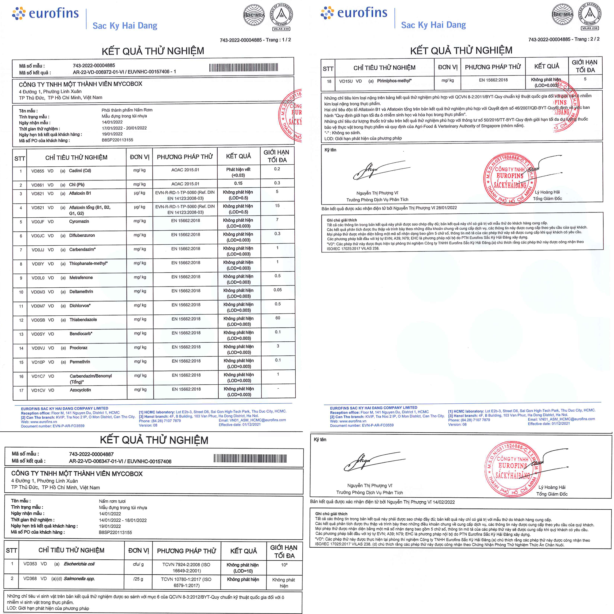 Chất lượng phôi nấm và nấm tươi đạt tiêu chuẩn sạch và an toàn, được chứng nhận bởi trung tâm kiểm nghiệm quốc tế Eurofins.
