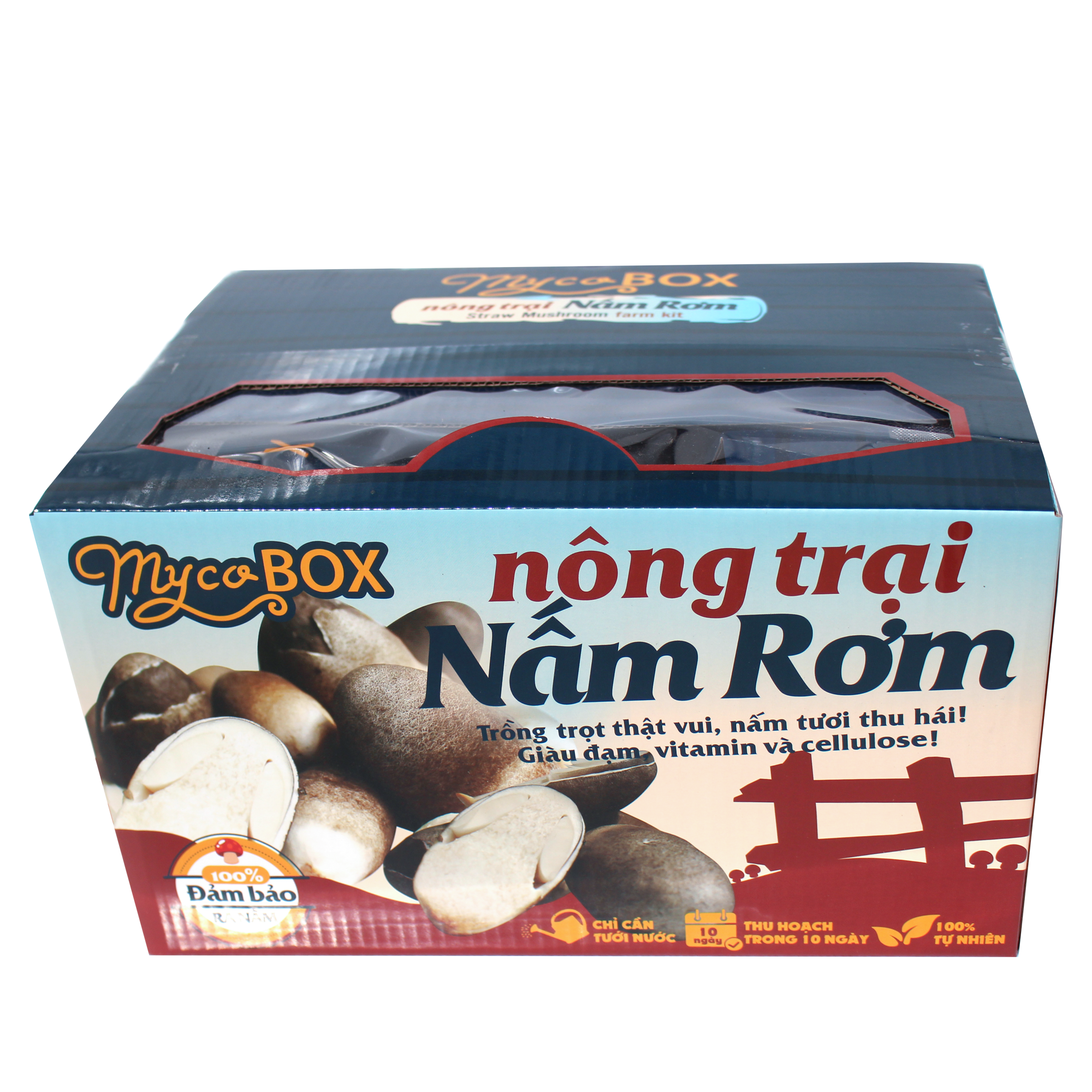 Chỉ 1 lần tưới nước, đặt Nông trại nơi sáng nhẹ và kín gió, Nấm Rơm sẽ tự tượng hình từ những sợi tơ và phát triển thành những búp nấm tươi giòn ngọt sau 7-10 ngày.