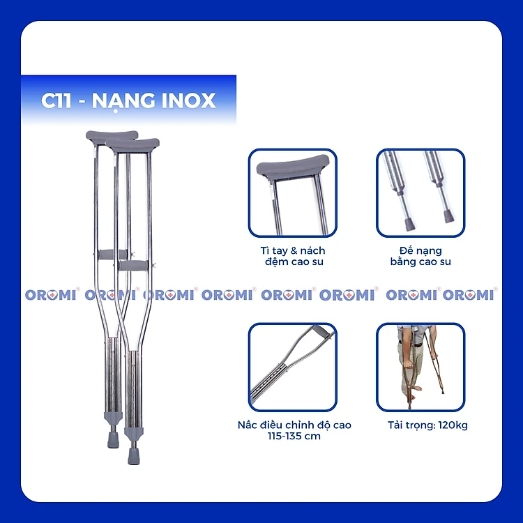 Nạng chống nách nhôm/inox có cao su mềm OROMI C11/C12 - Dụng cụ hỗ trợ người khuyết tật