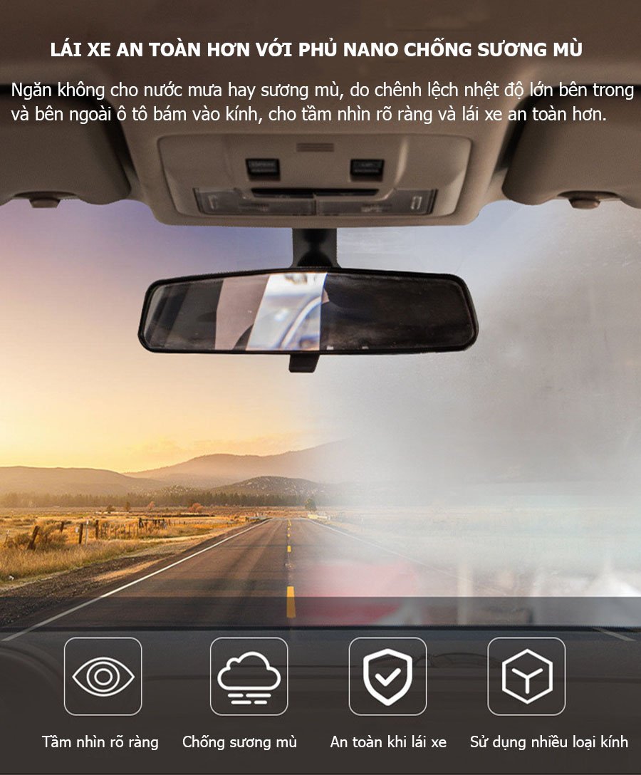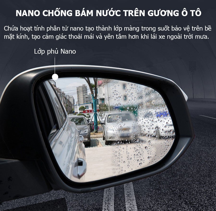 Công nghệ nano có tính chất kháng nước mạnh mẽ và độc đáo. Khi kính xe được phủ nano, nước mưa sẽ gom lại thành từng giọt và chảy xuống mà không cần phải sử dụng cần gạt nước. Điều này giúp cải thiện tầm nhìn của bác tài. Tạo cảm giác thoải mái và yên tâm hơn khi lái xe trong trời mưa.