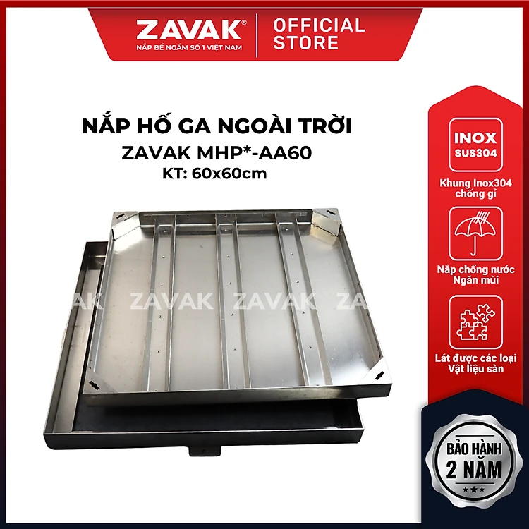 Nắp hố ga ngoài trời inox ZAVAK MHP*-AA60 / KT 60x60cm, lát gạch tối đa 4cm/ tải 800kg