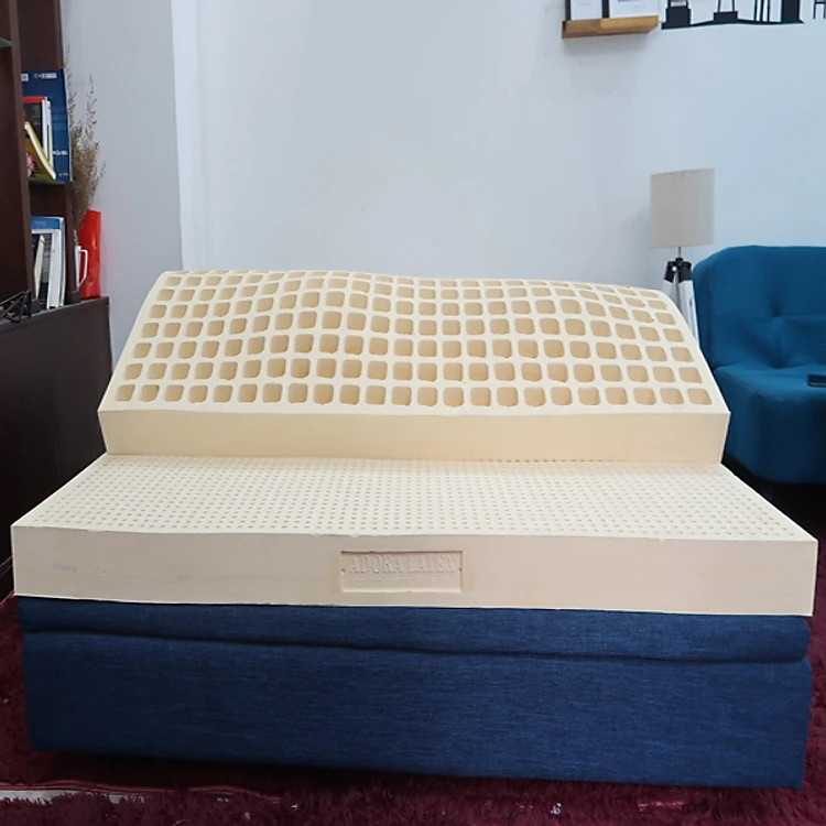 Cấu tạo Nệm cao su Adora Latex với cấu tạo 5000 lỗ tròn nhỏ trên bề mặt nệm và kèm theo đó là 500 ô vuông nhỏ bên dưới. Với cấu tạo như vậy làm giảm khối lượng cao su để giảm giá thành sản phẩm và kèm theo đó chính là đem lại sự thông thoáng cho người nằm.