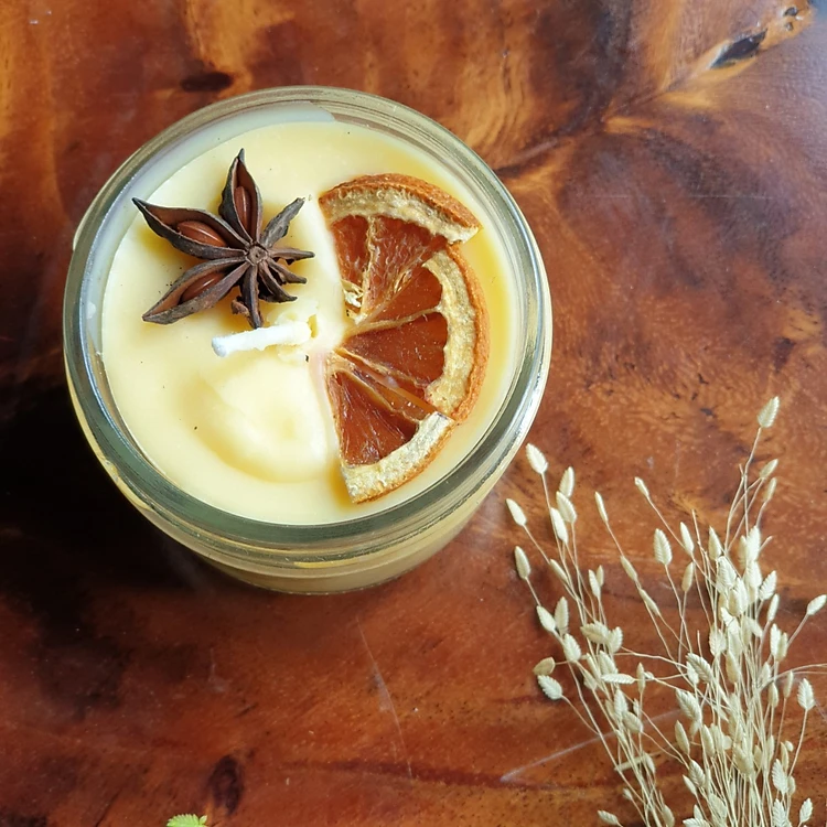 Nến thơm tinh dầu hoàn toàn sử dụng thành phần tự nhiên từ: sáp ong, sáp đậu nành, sáp cây cọ, hoa khô thật và tinh dầu Quýt (cam).