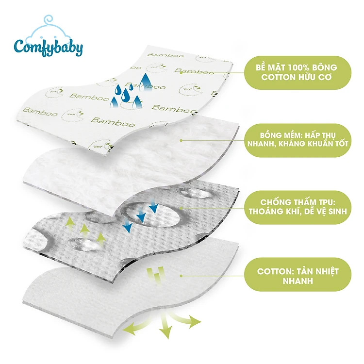 Tấm lót chống thấm thay tã cho bé 4 lớp 100% Sợi Tre Bamboo / Organic cotton (Cotton hữu cơ) thoáng khí, chống thấm nước Comfybaby