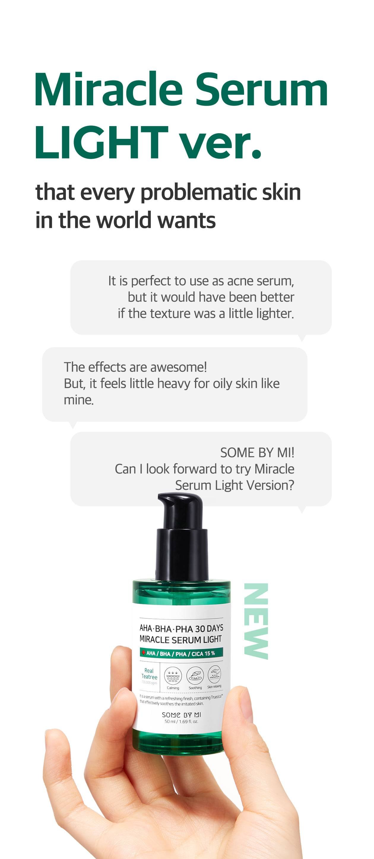 Tinh chất dưỡng da Some By Mi AHA-BHA-PHA 30 Days Miracle Serum Light là sự bổ sung mới cho Dòng Miracle của thương hiệu Hàn Quốc, SOME BY MI. Đó là sự đáp ứng yêu cầu của khách hàng về một phiên bản nhẹ hơn của SOME BY MI AHA-BHA-PHA 30 Days Miracle Serum.