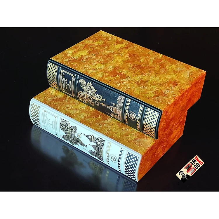 - Sách có hộp đựng bằng carton, hoa văn trang trí in thủy ấn. Viền hộp bằng da đồng màu với sách.