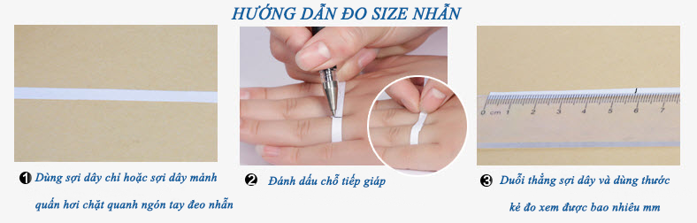 Lấy một sợi dây chỉ mảnh hoặc mảnh giấy nhỏ hình chữ nhật (Như hình ), quấn quanh ngón tay cần đeo nhẫn, đánh dấu, sau đó duổi thẳng sợi dây và dùng thước kẻ đo chính xác từng mm. Trường hợp xương khớp ngón tay của bạn to, thì bạn nên đo chu vi ở gần khớp dưới (không phải trên khớp) Sao cho khi đeo nhẫn dễ vào nhưng không bị tuột mất. Sau đó lấy số mm đo được chia cho 3.14 ra được kết quả đường kính chiếc nhẫn và đối chiếu với bảng size bên trên.