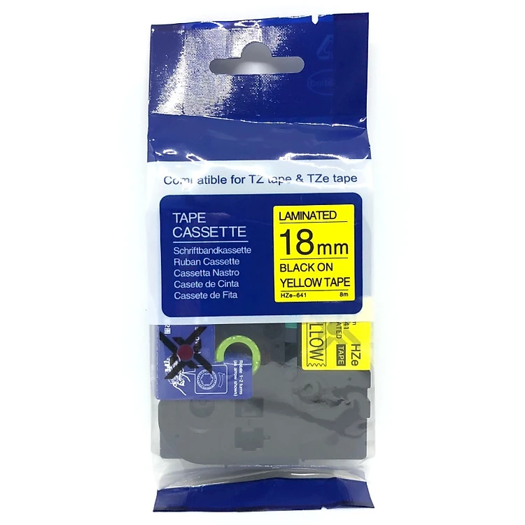 Nhãn in tiêu chuẩn HZe-641, khổ 18mm x 8m, chữ đen nền vàng, dùng cho máy in nhãn Brother