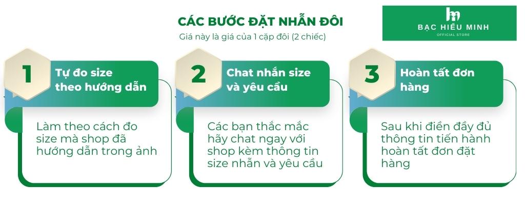 - Sau khi đặt hàng quý khách báo lại size nhẫn qua mục chat. Hoặc Bạc Hiểu Minh sẽ chủ động liên hệ với quý khách hàng để bổ sung thông tin còn thiếu.
