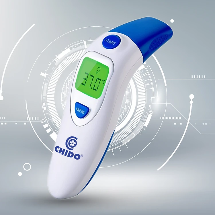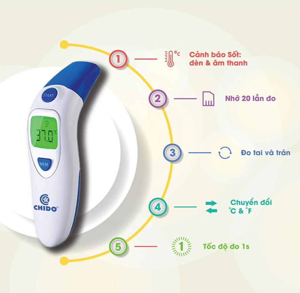 Nhiệt kế hồng ngoại Chido sử dụng công nghệ cảm biến hồng ngoại tiên tiến giúp kiểm soát thân nhiệt và cho kết quả chính xác, đáng tin cậy chỉ trong 1s. Kết quả đo trực tiếp hiển thị trên màn hình LCD kỹ thuật số với đèn nền rõ ràng để đọc. Bên cạnh đó, máy còn được trang bị chức năng báo sốt, khi thân nhiệt lên đến 38 độ C, đèn sẽ chuyển nền đỏ và phát ra tiếng bíp để cảnh báo bệnh nhân. Máy có 2 đơn vị để chuyển đổi là Fahrenheit hoặc Celsius với dung lượng lưu trữ lên tới 20 nhóm dữ liệu đo. Sau 30s không hoạt động, máy sẽ tự tắt.