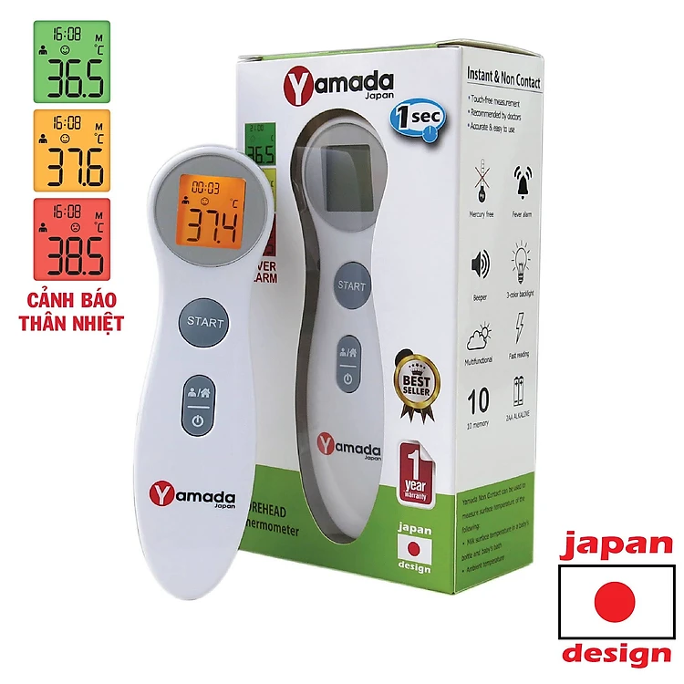 Nhiệt kế điện tử hồng ngoại đo trán không chạm Yamada - đo nhanh 1 giây, cảnh báo sốt, màn hình 3 màu đèn, đo sữa, nước tắm, nhiệt độ phòng