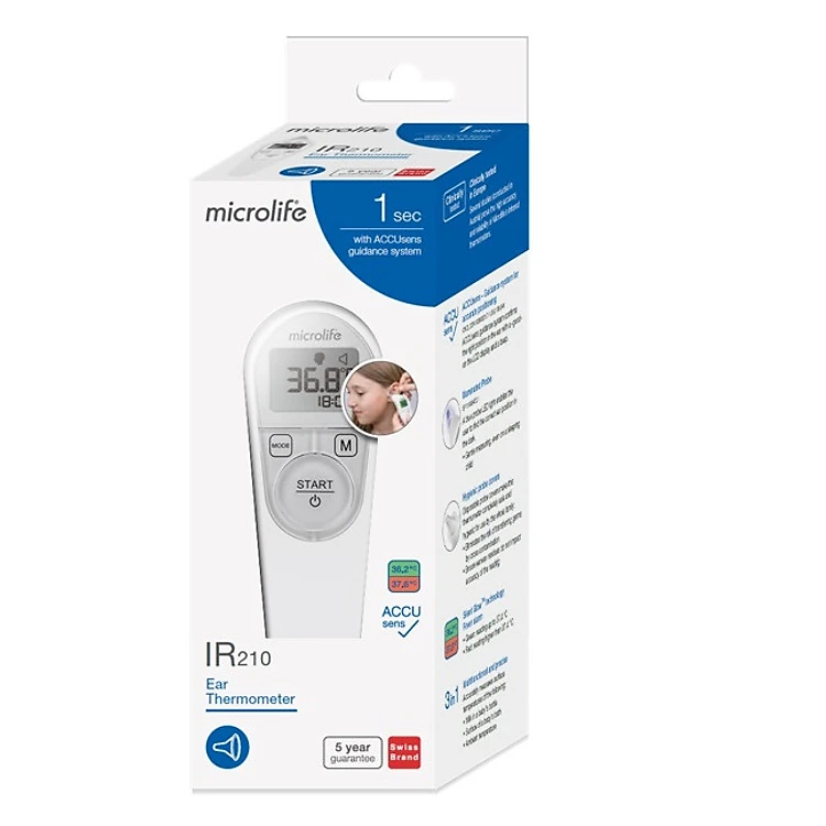 Nhiệt kế điện tử đo tai Microlife IR210 được thiết kế nhỏ gọn, dễ sử dụng. Nhiệt kế thích hợp đo thân nhiệt trẻ em, người lớn bằng cách đo nhiệt độ qua tai, cho kết quả nhanh chóng và chính xác