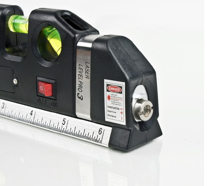 Ngoài ra để xác định trọng tâm của vật thì bạn có thể sử dụng tia chiếu laser. Ni vô laser đa năng V1 có 3 dạng tia laser là : ngang - dọc - chữ thập. Bên cạnh đó thiết bị còn tích hợp thêm thước dây dài 2,5m, đế cũng là thước 15cm và 6 inch.
