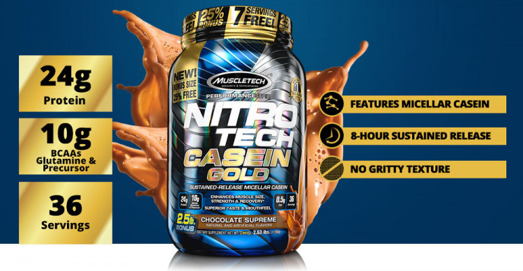 Nâng cao khả năng hồi phục cơ bắp của bạn với việc duy trì dưỡng chất cần thiết. Nitro-TECH  100% Casein Gold là sản phẩm cung cấp protein tiêu hóa chậm,  cung cấp 24g Protein chất lượng cao được lấy từ nhiều nguồn cao cấp khác nhau và chứa các amino acid được kéo dài để giữ cơ bắp của bạn lên đến 8 giờ. Hơn nữa, mỗi phụ gia tăng cường của Nitro-TECH  100% Casein Gold chứa 10g BCAAs, glutamine và tiền chất có trong tự nhiên và chỉ có 1g đường. Không chỉ đạt giải thưởng về hương vị ngon mà  Nitro-TECH  100% Casein Gold còn đem lại giá trị về mặt xây dựng cơ bắp tương đương.
