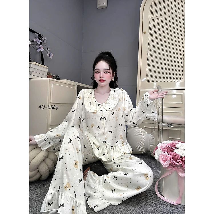 [NN Pijama] Bộ Pijama Lụa Nữ Phối Bèo Kèm Cột Tóc