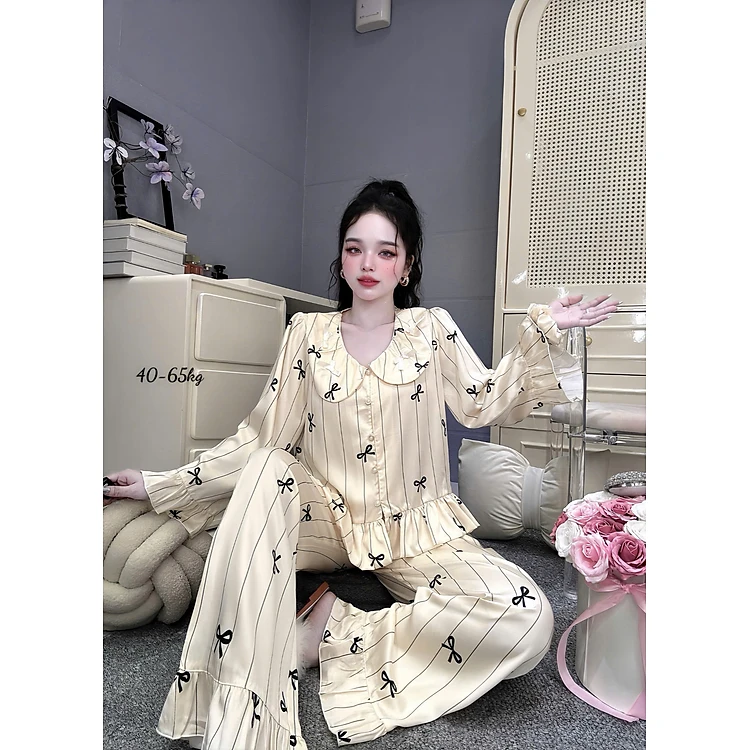 [NN Pijama] Bộ Pijama Lụa Nữ Phối Bèo Kèm Cột Tóc
