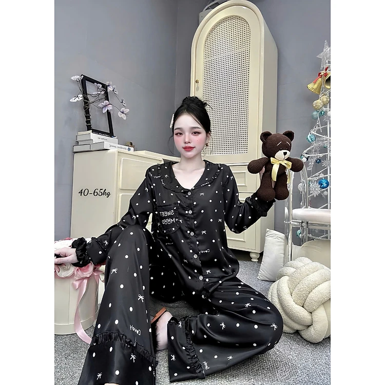 [NN Pijama] Bộ Pijama Lụa Nữ Tay Dài Phối Bèo Kèm Cột Tóc