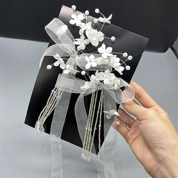 Nơ ruy băng voan cài tóc đính hoa chấm hạt trai