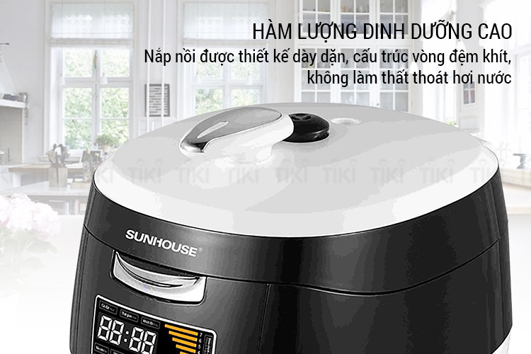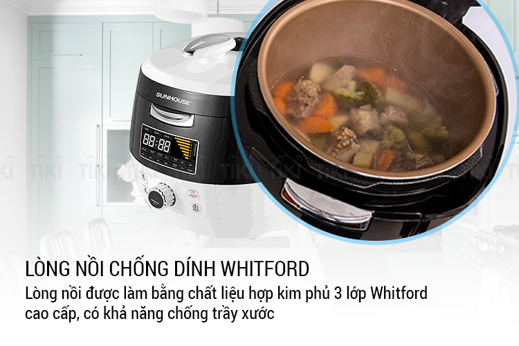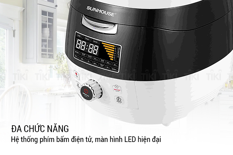 Nồi áp suất đa năng Sunhouse SHD1858BW với công suất lớn 1000W, cùng nhiều chế độ nấu khác nhau, giúp bạn có thể nấu được nhiều món như hầm gân, súp, cháo, gà, Tích hợp 3 trong 1: nồi nấu luộc, nồi hầm ninh, nồi hấp kho. Nồi có 15 công năng được cài đặt sẵn, thích hợp với nhiều loại thực phẩm khác nhau (cá, gà, thịt bò, thịt lợn, rau củ…) và những mục đích chế biến khác nhau, cho bữa ăn gia đình phong phú và thu hút hơn. Hệ thống phím bấm điện tử, màn hình LED hiện đại, tính năng thể hiện bằng tiếng Việt. Van xả áp an toàn, tự nhận biết nắp và lòng nồi đã đặt đúng vị trí chưa.