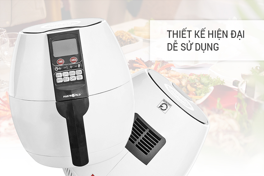 Nồi chiên có bảng điều khiển bằng điện tử, nhiều chế độ nướng chiên đã được lập trình sẵn cùng màn hình hiển thị LCD rõ nét dể dàng quan sát khi chiên nướng. Thang nhiệt độ từ 80 độ tới 200 độ cùng chế độ tự ngắt khi nấu xong. Chức năng hẹn giờ sẽ giúp bạn kiểm soát được tối đa thời gian hoạt động của nồi.