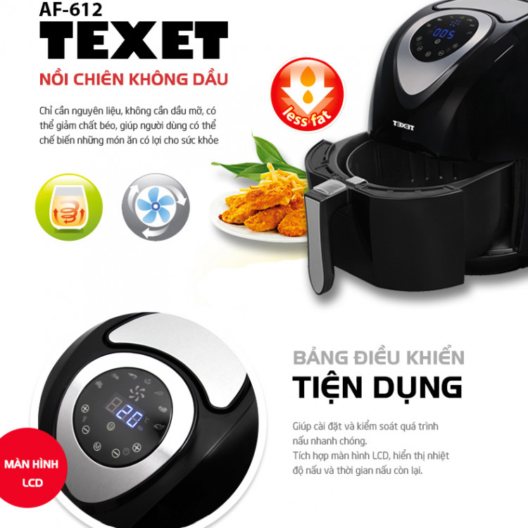Hạn chế dầu mỡ‚ tốt cho sức khỏe‚ làm được nhiều món chiên nướng‚ tiết kiệm được thời gian‚ giảm được lượng mỡ dư thừa khi nấu ăn là những điều mà sản phẩm Nồi chiên không dầu cao cấp TEXET AF-612 mang đến cho người tiêu dùng Việt Nam với một mức giá đặc biệt với nhiều quà tặng‚ ưu đãi hấp dẫn cùng những chế độ chăm sóc khách hàng chu đáo và tận tình.