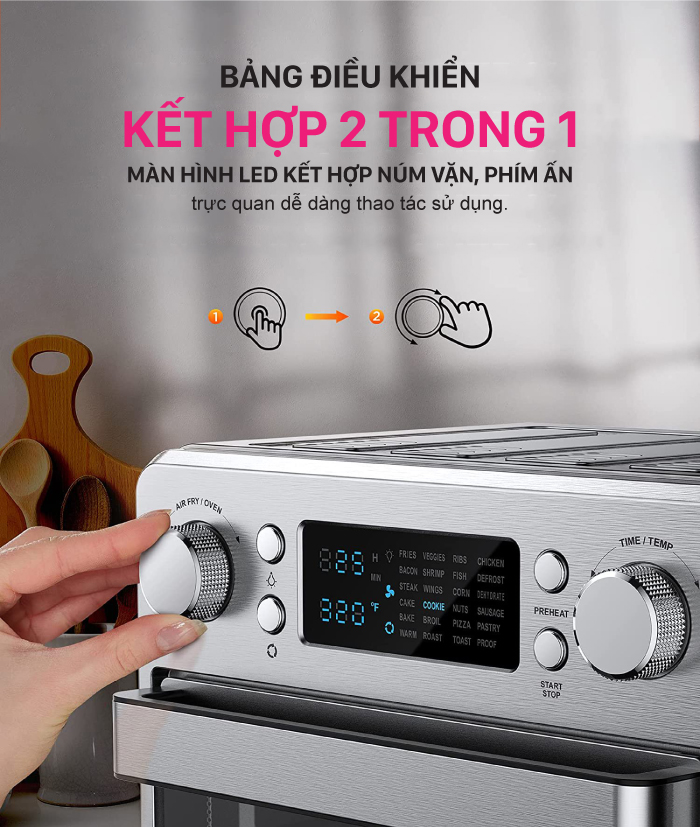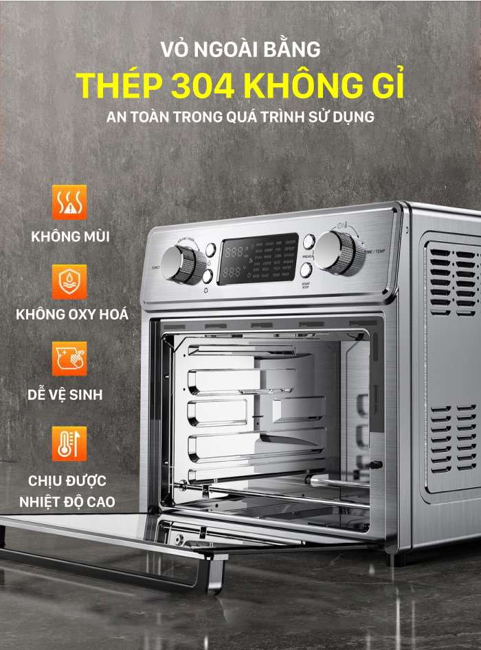 Nấu, nướng đa chức năng 10 trong 1: Chiên không dầu, nướng, làm bánh, Pizza, hấp, dã đông, quay thịt, sấy khô, món om, làm khô thức ăn, làm bánh mỳ….
