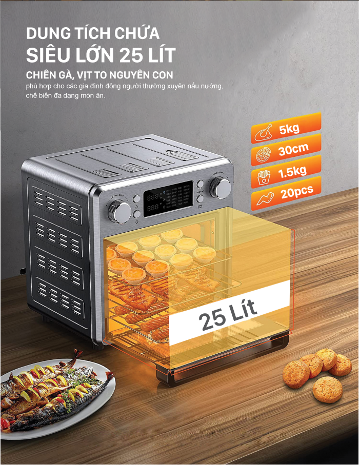 Nồi chiên không dầu điện tử đa chức năng ROLER RA-3120A sở hữu dung tích lớn 25L cùng công suất 1700W giúp chiên nướng lượng lớn thức ăn một cách nhanh chóng, cho món ăn chín nhanh, ít dầu, tốt cho sức khỏe của người dùng, tiết kiệm thời gian và lưu thông khí nóng 360 độ C. Dung tích lớn thích hợp cho những thức ăn lớn, gà vịt nguyên con mà không cần chặt nhỏ, tiết kiệm thời gian công sức và làm tăng tính thẩm mỹ cho món ăn.