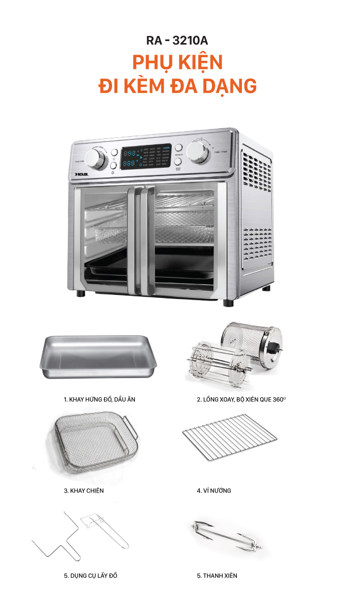 Nồi chiên có phụ kiện đa dạng có thể nấu nhiều món khác nhau: Xiên quay, Giỏ/lồng quay, Nhông quay, Dụng cụ lấy đồ, Khay hứng đồ/Dầu ăn, Vỉ nướng chống dính, tấm lưới chắn. Khi sở hữu nồi chiên không dầu đa chức năng ROLER RA-3119A là bạn đã có trong tay một chiếc nồi đa năng, làm được rất nhiều món ăn thơm ngon cùng lúc.