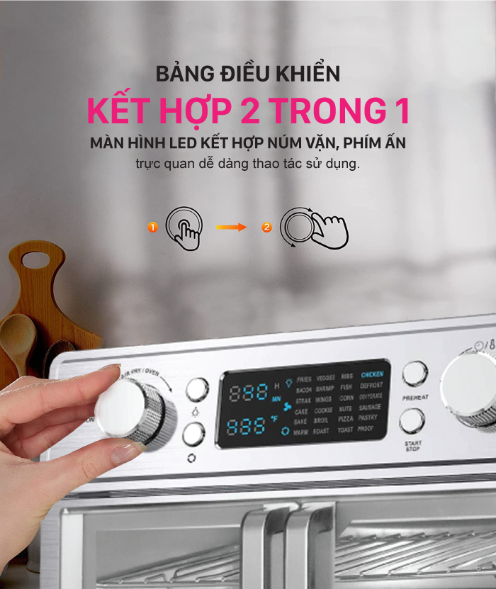 Nấu, nướng đa chức năng 10 trong 1: Chiên không dầu, nướng, làm bánh, Pizza, hấp, dã đông, quay thịt, sấy khô, món om, làm khô thức ăn, làm bánh mỳ….
