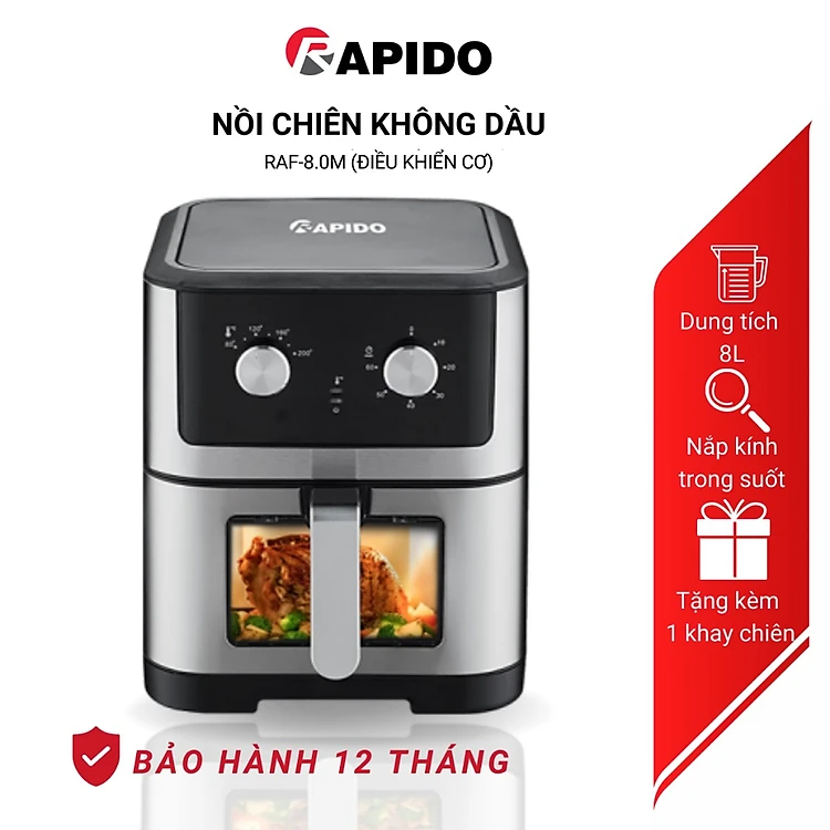 Nồi chiên không dầu Rapido RAF 8.0M dung tích 8L chiên gà vịt nguyên con, chống dính an toàn - Hàng chính hãng