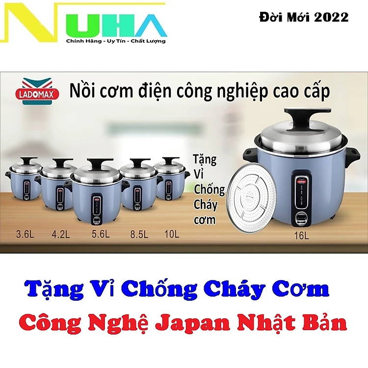 Nồi cơm điện công nghiệp Ladomax Nhật dung tích 3.6/4.2/5.6/8.5/10/16L kèm vỉ hấp chống cháy cơm-Hàng chính hãng