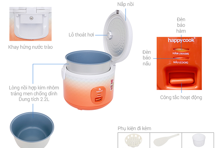Nồi Cơm Điện Nắp Gài Happy Cook HCJ-220 được thiết kế dạng nắp gài sang trọng kết hợp những đường màu cam trắng tinh tế tạo điểm nhấn nổi bật cho không gian bếp nhà bạn. Sản phẩm được trang bị nắp gài tự động, quai cầm tích hợp ngay trên nắp, giúp bạn thuận tiện sử dụng.
