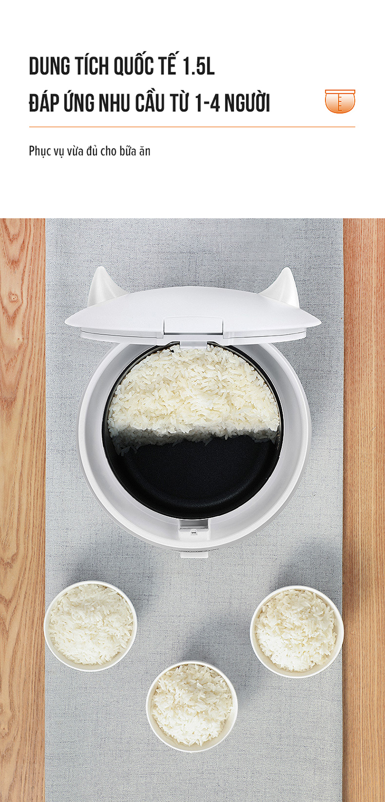 Nồi dung tích 1.5 lít nhỏ gọn, thích hợp dùng cho người độc thân, vợ chồng mới cưới, gia đình… phục vụ cơm ngon cho 2 - 4 người dùng. Công suất 300W với công nghệ hiện đại truyền nhiệt tốt giúp nấu cơm mau chín, tiết kiệm điện năng, cơm ngon sẵn sàng chỉ sau 20 – 30 phút nấu.