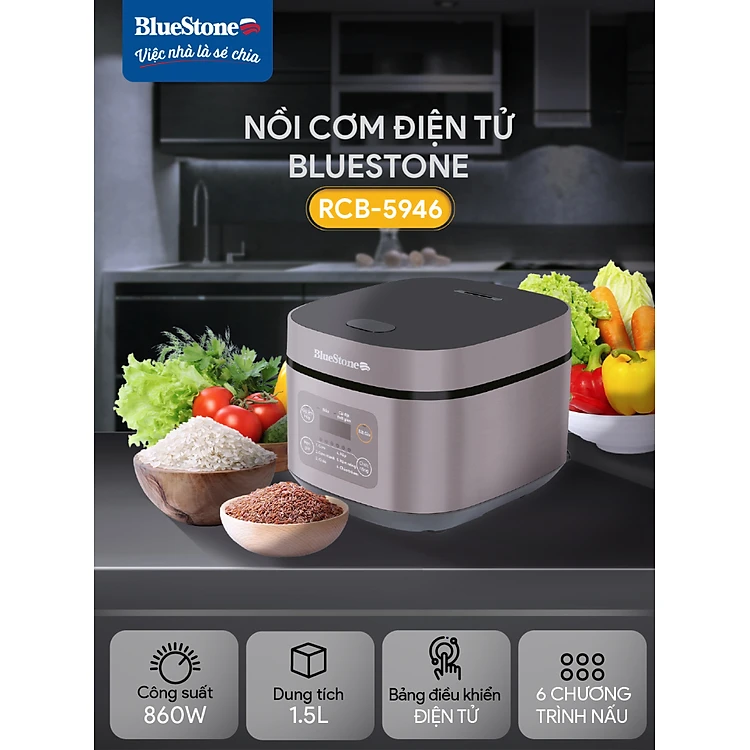Nồi Cơm Điện Tử BlueStone RCB-5946 - Dung Tích 1,5 lít - Công suất 860W - Lòng nồi phủ chống dính cao cấp an toàn sức khỏe - 6 chế độ cài đặt sẵn - Bảo hành 2 năm - Hàng chính hãng