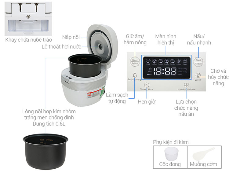 Nồi cơm điện bao gồm nấu cơm, nấu nhanh, nấu ngũ cốc, gạo lứt, cháo, bánh quy giòn, hấp. Ngoài ra còn có chức năng giữ ấm, hâm nóng, hẹn giờ, nấu tiết kiệm năng lượng, tự làm sạch giúp bạn sử dụng nồi đa dạng, thuận tiện, linh hoạt hơn.