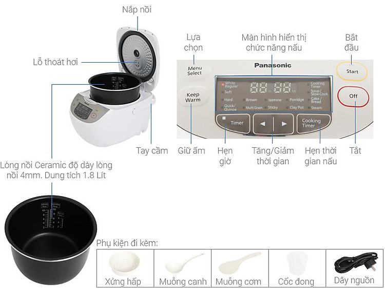 Nồi cơm điện Panasonicthiết kế đẹp mắt, màu sắc trang nhã, dung tích 1.8 lít đáp ứng đủ nhu cầu nấu cơm cho gia đình 4 - 6 người