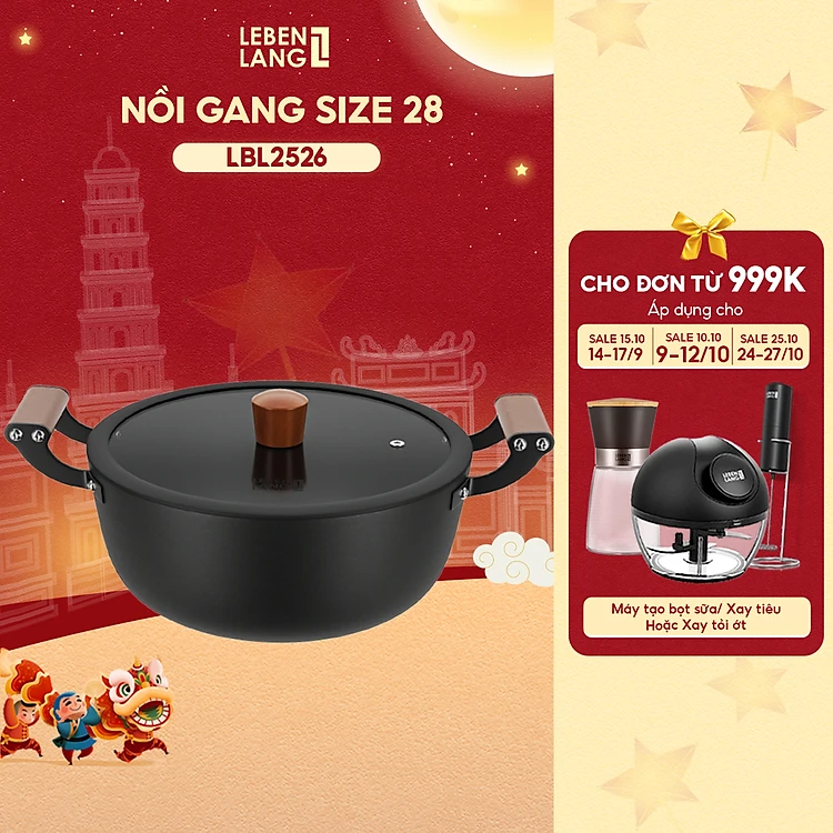 Nồi gang chống dính đa năng Lebenlang LBL2526, size 28, 5.6L, nắp kính tay cầm gỗ dùng mọi loại bếp - hàng chính hãng