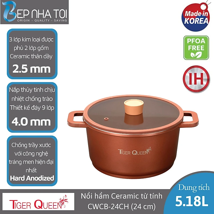 Nồi hầm Ceramic từ tính Tiger Queen CWCB-24CH - Màu nâu chocolate [24cm - 5.18L] - Chính hãng