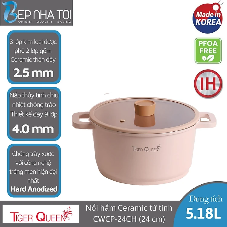 Nồi hầm Ceramic từ tính Tiger Queen CWCP-24CH - Màu hồng hoa anh đào [24cm - 5.18L] - Chính hãng