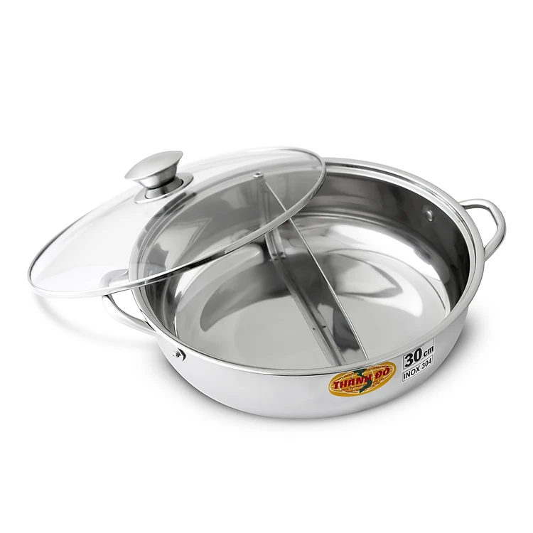 Nồi lẩu 2 ngăn inox 304 Thành Đô nên dày hơn các loại inox khác, Nồi nước lẩu được thiết kế đặc biệt, có 2 ngăn. Nồi đa năng, tiện lợi, 1 nồi lẩu có 2 khoang riêng biệt giúp bạn có thể ăn 2 món lẩu 1 lúc như lẩu thái, lẩu hải sản, …Nắp kim loại vừa khít. Làm nóng cực nhanh.