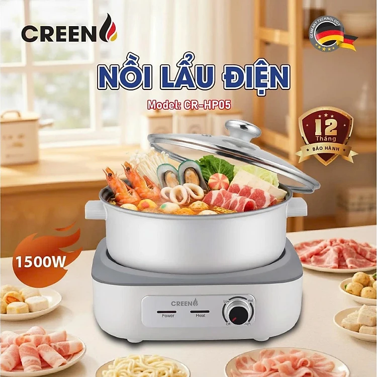 Nồi Lẩu Điện Đa Năng 5L CREEN CR-HP05 Thiết Kế Tháo Rời Độc Đáo, 1500W Bảo Hành 12 Tháng - Hàng Chính Hãng